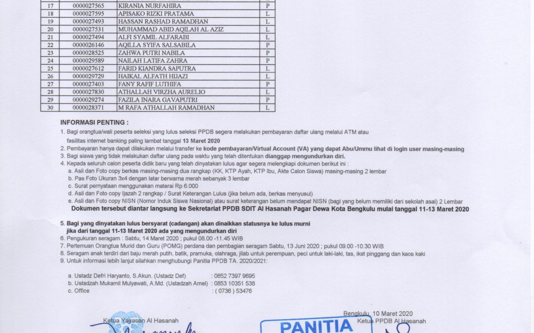 Pengumuman Calon Siswa Baru SDIT Al Hasanah 1 Pagar Dewa dan SDIT Al Hasanah 2 Betungan Tahun 2020-3