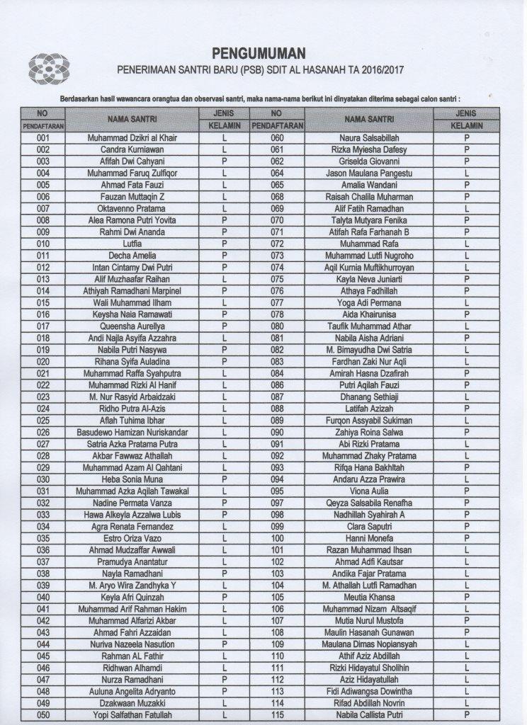 Setelah melalui beberapa tahap proses Penerimaan Santri Baru (PSB) SDIT Al Hasanah, maka hari ini kami umumkan daftar nama santri SDIT Al Hasanah T.A 2016/2017 yang dinyatakan LULUS.